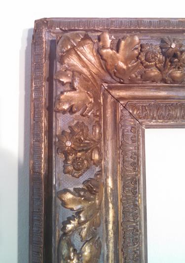 JE37A3QRF: 19th century gesso over wood frame. All frames are in as found condition and most have minor defects and/or repairs. Note: While this frame retains much of its original gilding, it has been "antiqued" at some time in the past. Meaning a light color wash was applied to enhance the sense of age. This is a look that is highly prized by many decorators. Sold.